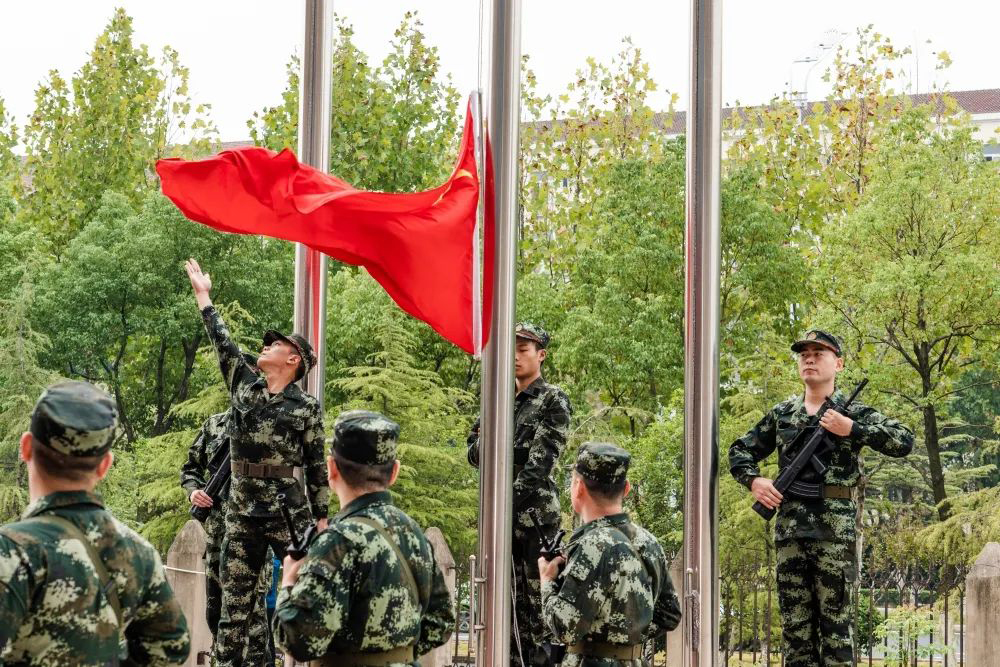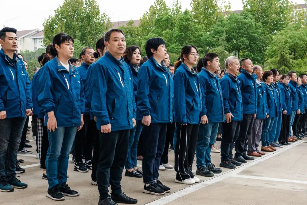 上午8點58分,升國旗儀式正式開始。迎著旭日的光輝,全體員工整齊列隊、莊嚴肅穆。英姿颯爽的護旗手邁著鏗鏘有力的步伐,護送國旗走向升旗臺。伴隨著雄壯激昂的《義勇軍進行曲》,鮮艷的五星紅旗冉冉升起、迎風飄揚。在嘹亮的國歌聲中,全體人員向冉冉升起的國旗行注目禮。