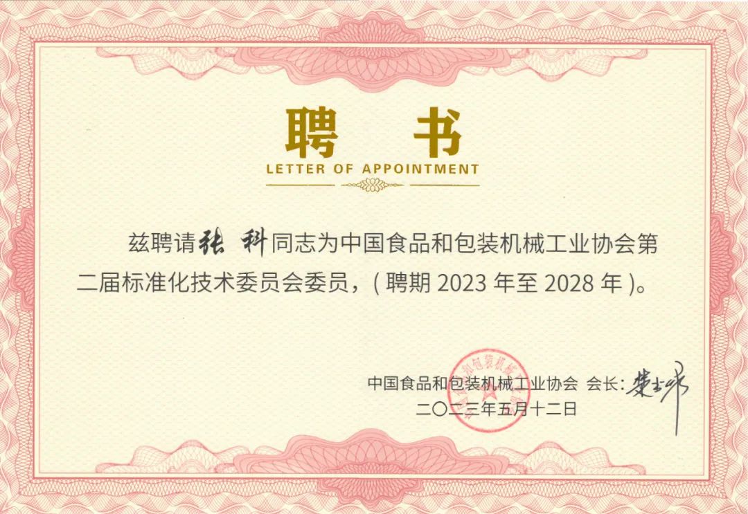 5月12日,第二屆中國(guó)食品和包裝機(jī)械工業(yè)協(xié)會(huì)標(biāo)準(zhǔn)化技術(shù)委員會(huì)(T/CFPMA )換屆大會(huì)召開。深耕專業(yè)領(lǐng)域20多年,作為行業(yè)內(nèi)標(biāo)桿人物及在專業(yè)領(lǐng)域的突出貢獻(xiàn),張科當(dāng)選為新一屆標(biāo)委會(huì)委員。