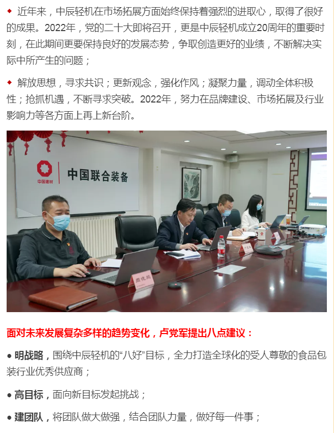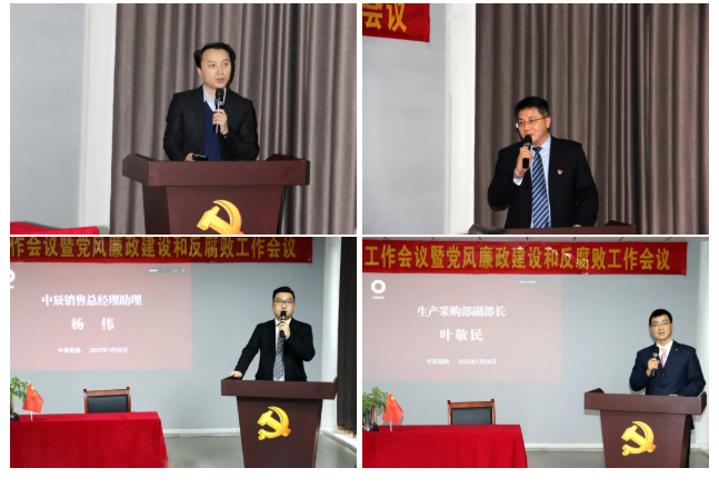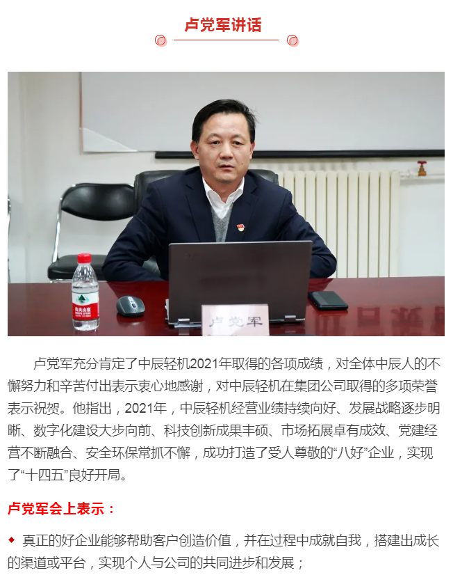On the afternoon of January 28, Hefei Light Machinery and Zhongchen Light Machinery held their annual work conference and party風 and anti-corruption work conference. Lu Dangjun, the Party Secretary, Chairman, and General Manager of China United Equipment, attended the meeting via video and delivered an important speech. Liu Baosheng, the Party Committee member and Secretary of the Discipline Inspection Commission of China United Equipment, and Zhou Xiaopeng, Director of the Department of Enterprise Management, and Kang Zixuan, Deputy Director of the Department of Administration and Personnel, attended the meeting. Gao Yibing, the Party Committee member and Production Director of Zhongchen Light Machinery, presided over the meeting.